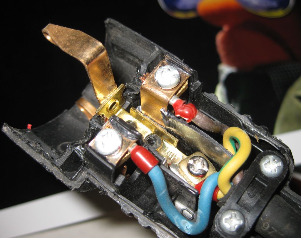 Als dieses allerdings beim Einstecken sowohl Sicherung als auch FI rausgeworfen hat, war "Forschen" angesagt. Normalerweise haette ich die sichtbar angeschmurgelte Kupplung einfach abgeschnitten und "in die Tonne getreten", aber ich war neugierig: Nach dem . mit Hebeleinsatz - oeffnen sah man: Da muss wohl mal ein bisschen viel Strom druebergelaufen sein ... Die duenne Isolierschicht zwischen Aussenleiter und Schutzleiter war nicht mehr da => satter Kurzer zwischen allen drei Kontakten ... nicht schoen ;-)
