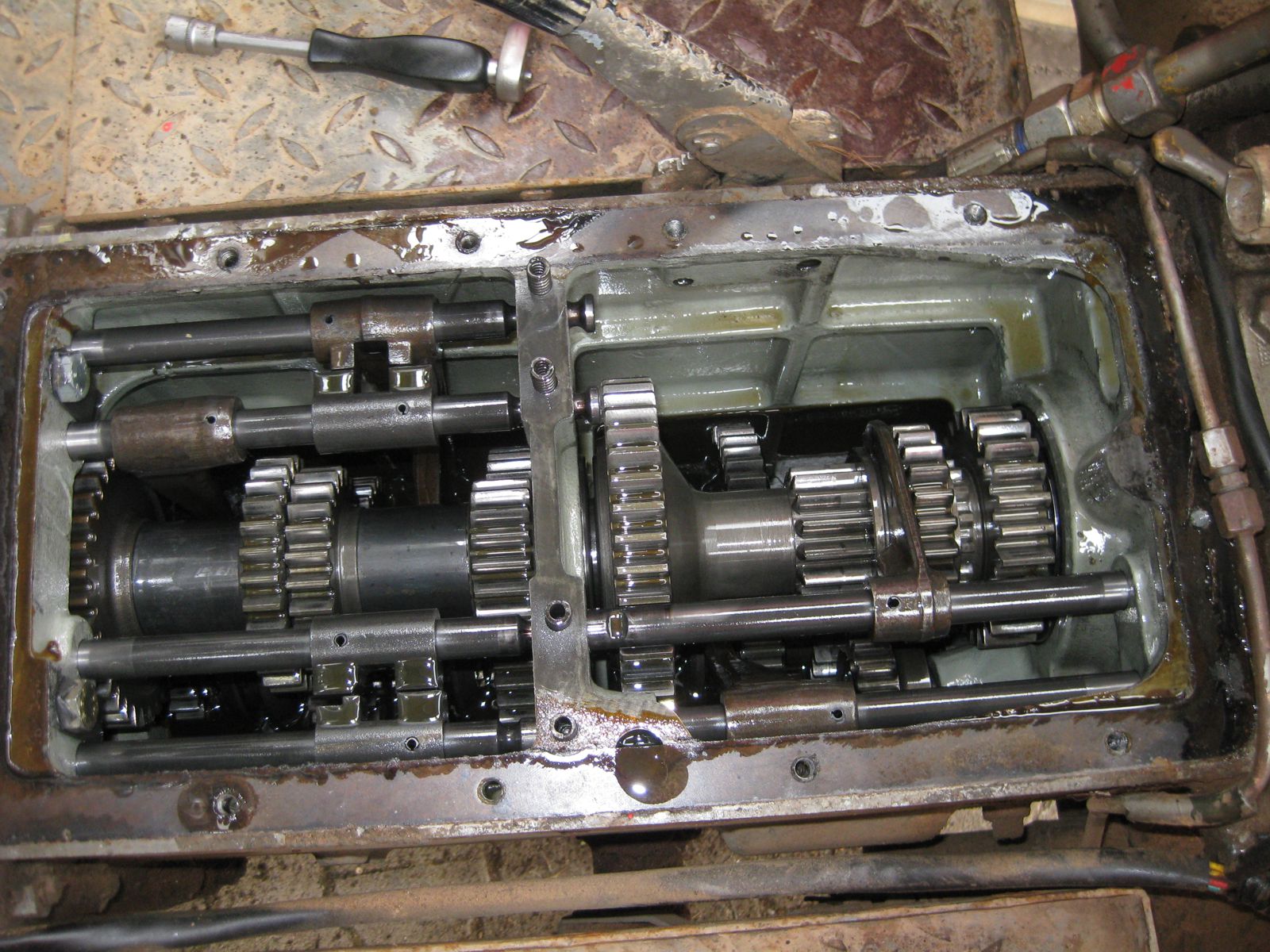 Von links in das Getriebe geblickt. Schoene Zahnraeder und deutlich sieht man die Schalt-Hebel.