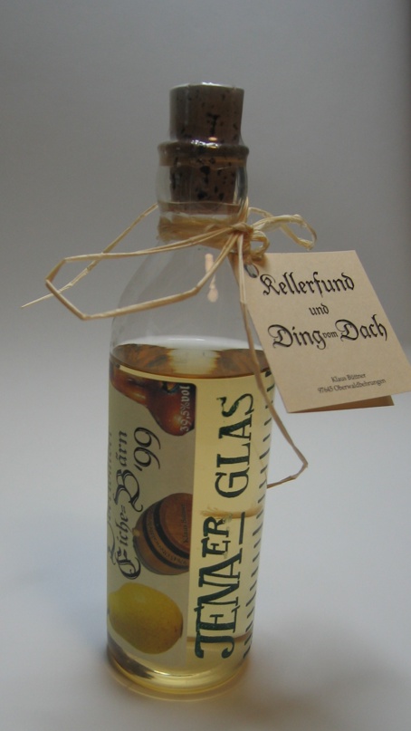 Ein 10 Jahre alter Birnenbrand im Eiche-Fass gereift und in Jenaer Glas abgefuellt.