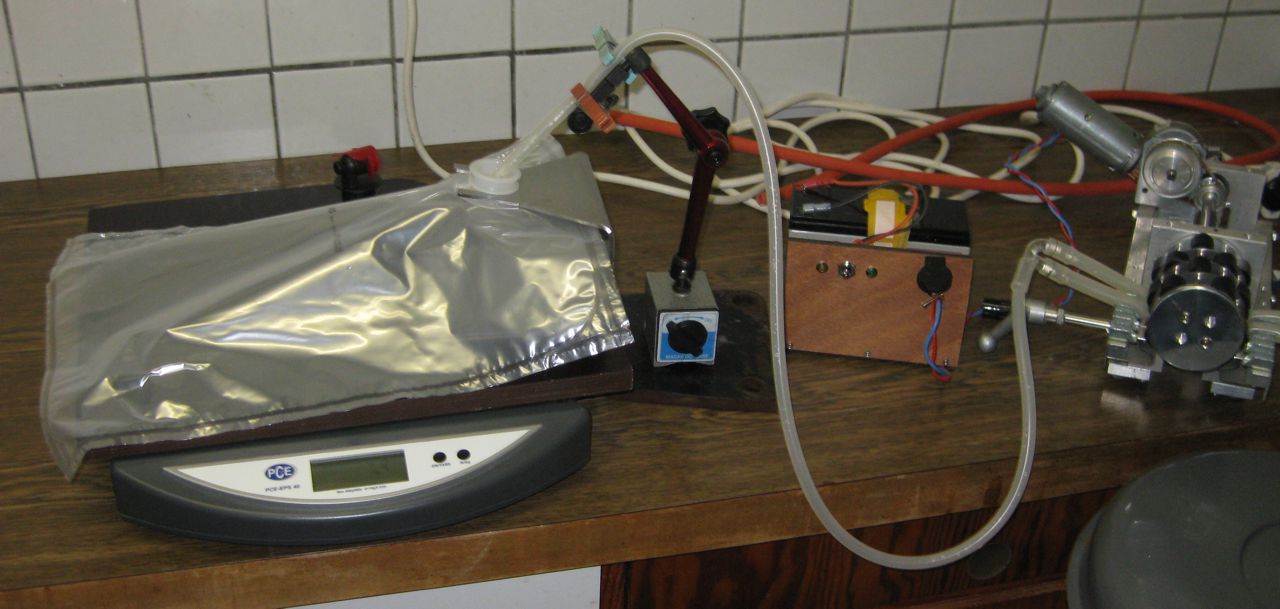 Dieses Jahr hatte ich keine Lust auf "Schoepfen und Trichter treffen." Deswegen habe ich die Pruefmechanik der Laborpumpe "Dosierfix" mal schnell fuers Abfuellen missbraucht. Hier sieht man den Aufbau vor dem Einsatz - ein Mess-Stativ mit Magnetfuss dient als Schlauchhalter.