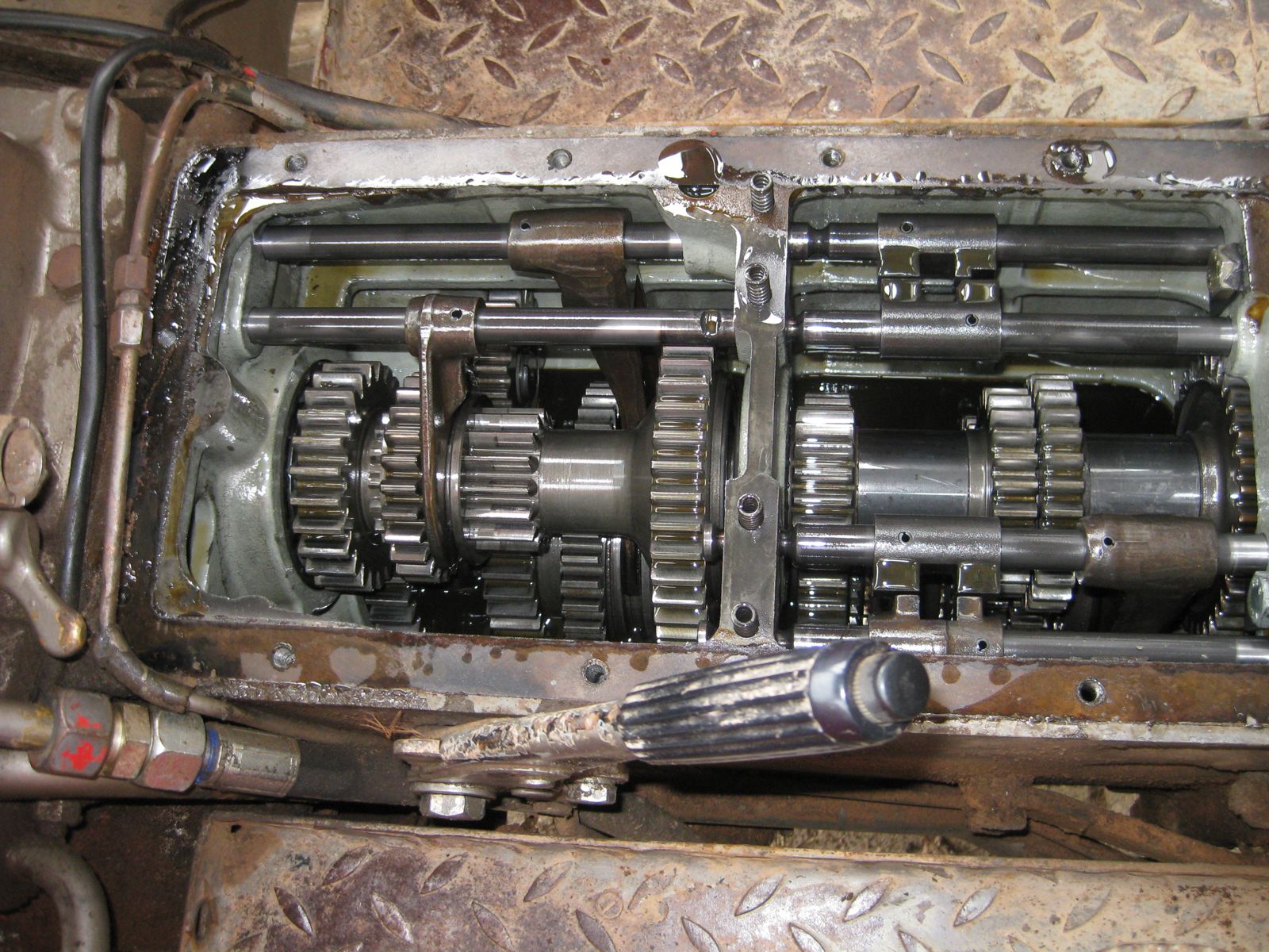 Von rechts in das Getriebe geblickt. Schoene Zahnraeder und deutlich sieht man die Schalt-Hebel.