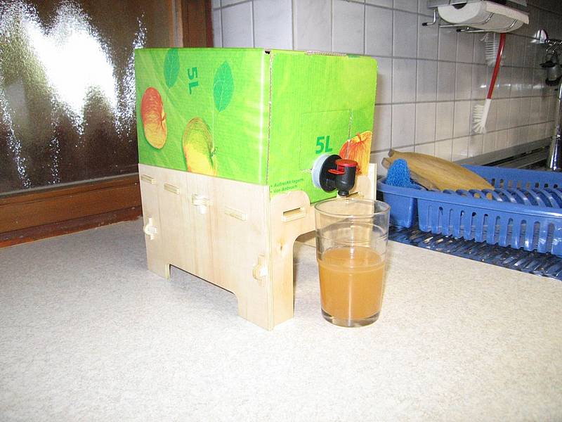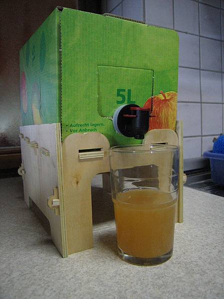 Auch darüber habe ich mir gedanken gemacht und die Fräse durfte mal Sperrholz bearbeiten. Herausgekommen ist ein "Bag-in-Box-Ständer". Ich hatte den Ehrgeiz, daß er ganz ohne Nägel, Schrauben und Leim halten sollte. 6 kleine Keile halten die Konstruktion zusammen. Ausgelegt für 6mm Sperrholz (das dünnere ist ja doch schon schwabbelich).