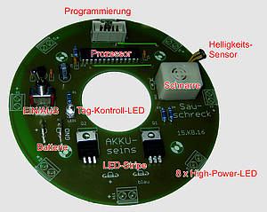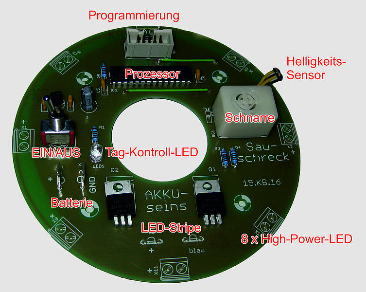 Wie auf dem Platinenfoto zu erkennen gibt es einen Ein-Aus-Schalter, den Anschluss für 8 High-Power-LEDs, den Anschluss für einen LED-Stripe rund um das Gehäuse, die Schnarre und die TAG-LED. Wenn der Sau-Schreck den Tag erkennt, stellt er das Blinken und Hupen ein, lediglich die TAG-LED blitzt einmal je Sekunde, damit man erkennt, dass er eingeschaltet ist.