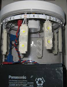 Beim Einschalten werden als Funktionskontrolle einmal alle Lichter und die Schnarre eingeschaltet. Eine vollgeladener Blei-Gel-Akku mit 12V/7,2Ah reicht ca. eine Woche.